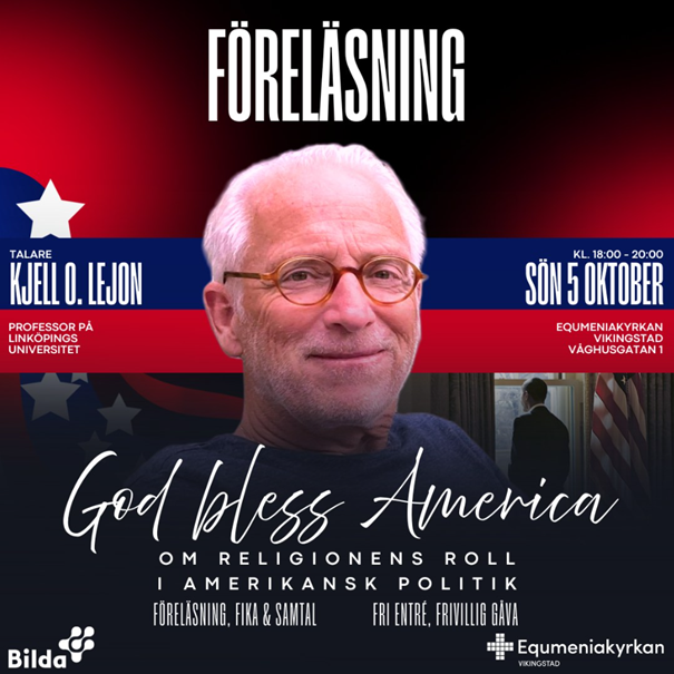 Välkommen på en föreläsning om religionens roll i amerikanska politik med temat ”God bless America” i Equmeniakyrkan Vikingstad söndagen den 5 oktober kl. 18-20. Vi får besök av professor Kjell O. Lejon som forskar om religion och politik i USA samt kristendomens historia vid Linköpings Universitet. Det blir föreläsning, fika och möjlighet att ställa frågor.