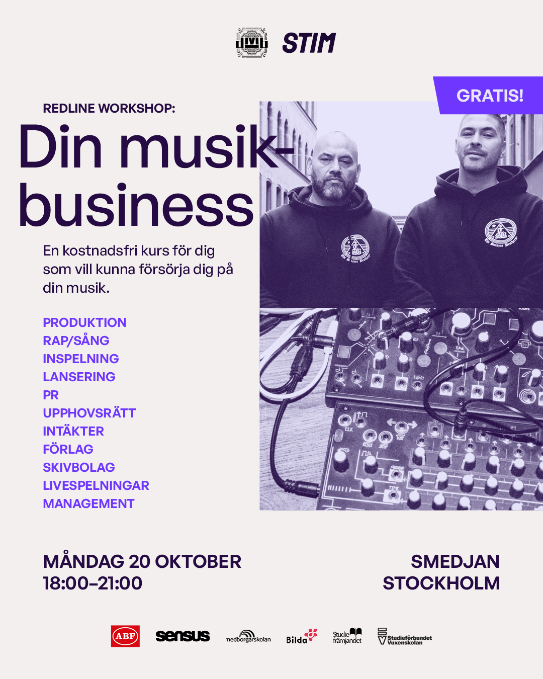 Föreläsningen sker i samarbete med : Bilda, ABF, Sensus, Medborgarskolan, Studiefrämjandet, Studieförbundet Vuxenskolan, STIM och Din Musikbusiness