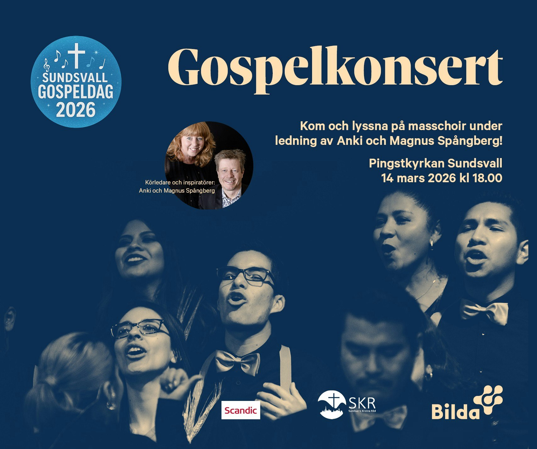 Detta är avslutningen på Sundsvalls gospeldag 2026. Anki och Magnus Spångberg leder repetitionerna med en stor kör under lördagen. Tillsammans med duktiga musiker avslutas dagen med denna Konsert kl.18.00 i Pingstkyrkan, Sundsvall.