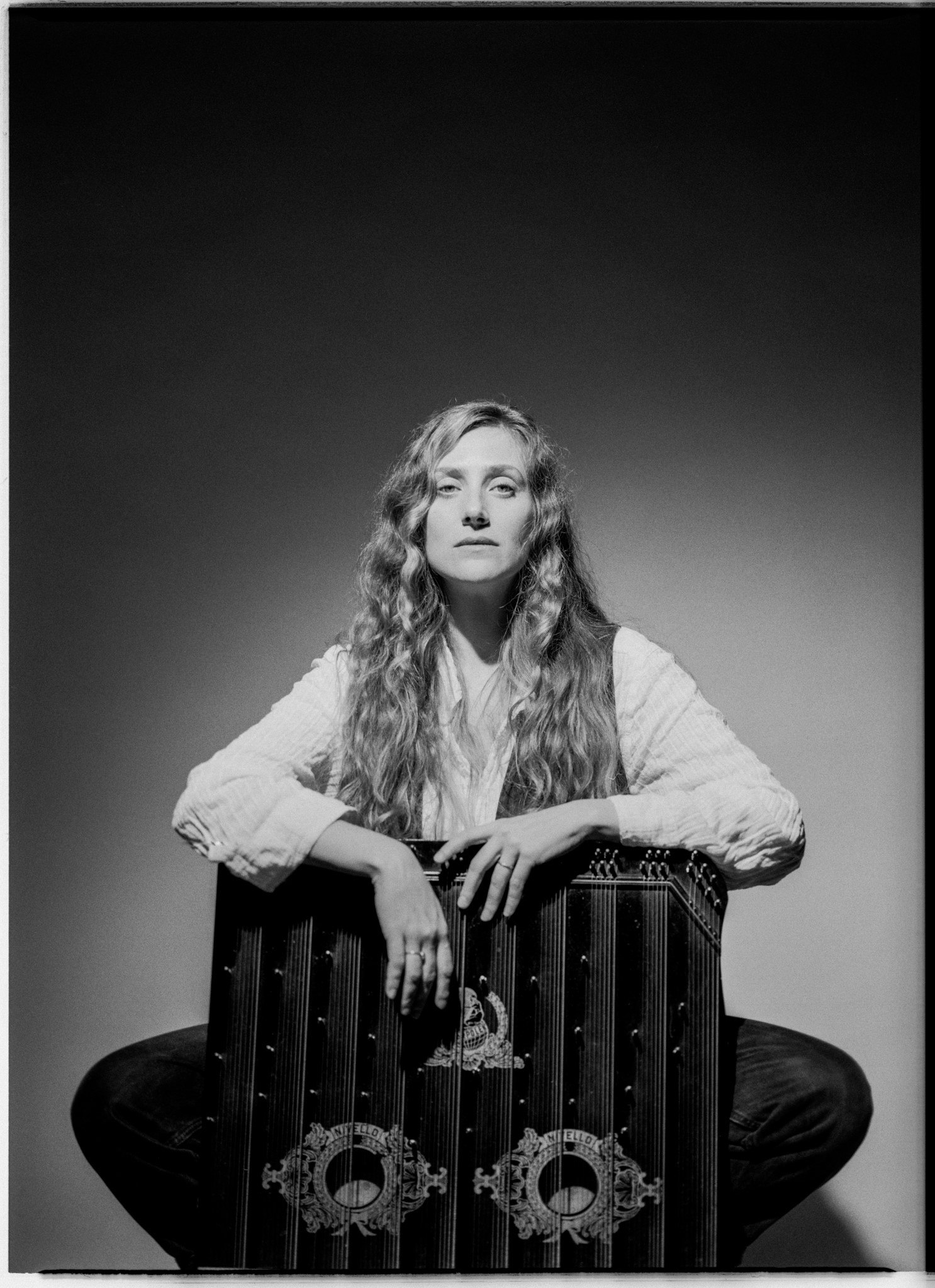 En kvinna med långt lockigt hår, klädd i randig skjorta och väst, håller i en upprättstående banjo och tittar lugnt på den.