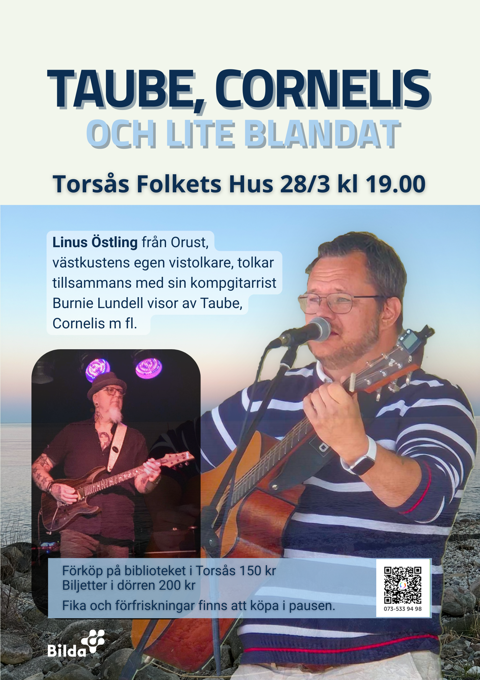 Biljetter: Förköp på biblioteket i Torsås 150 kr. Biljetter i dörren 200 kr.