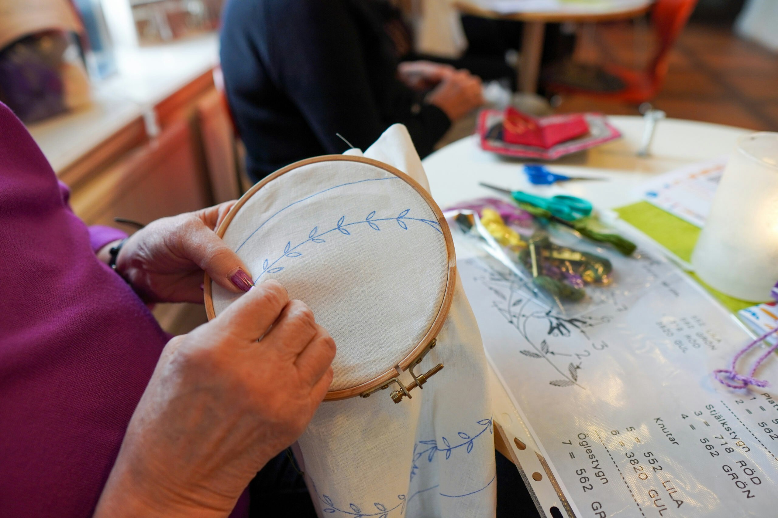 Det är ett glatt men något misstänksamt gäng som möter oss på Örnsköldsvik Museum och konsthall. Att bli fotograferade helt oförberett. Men ju mer tiden går, och när deltagarna får berätta för oss vad de håller på att brodera och visa sina omsorgsfullt skapade alster så slappnar de av. Alla är överens, på hantverksträffarna är det ingen tävlan utan alla har sin egen grej.