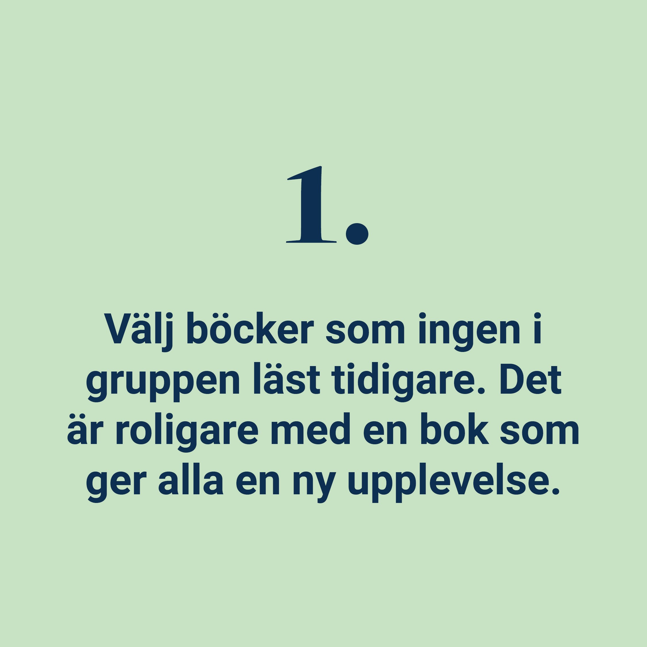 - Välj böcker som ingen i gruppen har läst tidigare. Det är roligare med en bok som ger en ny upplevelse åt alla.