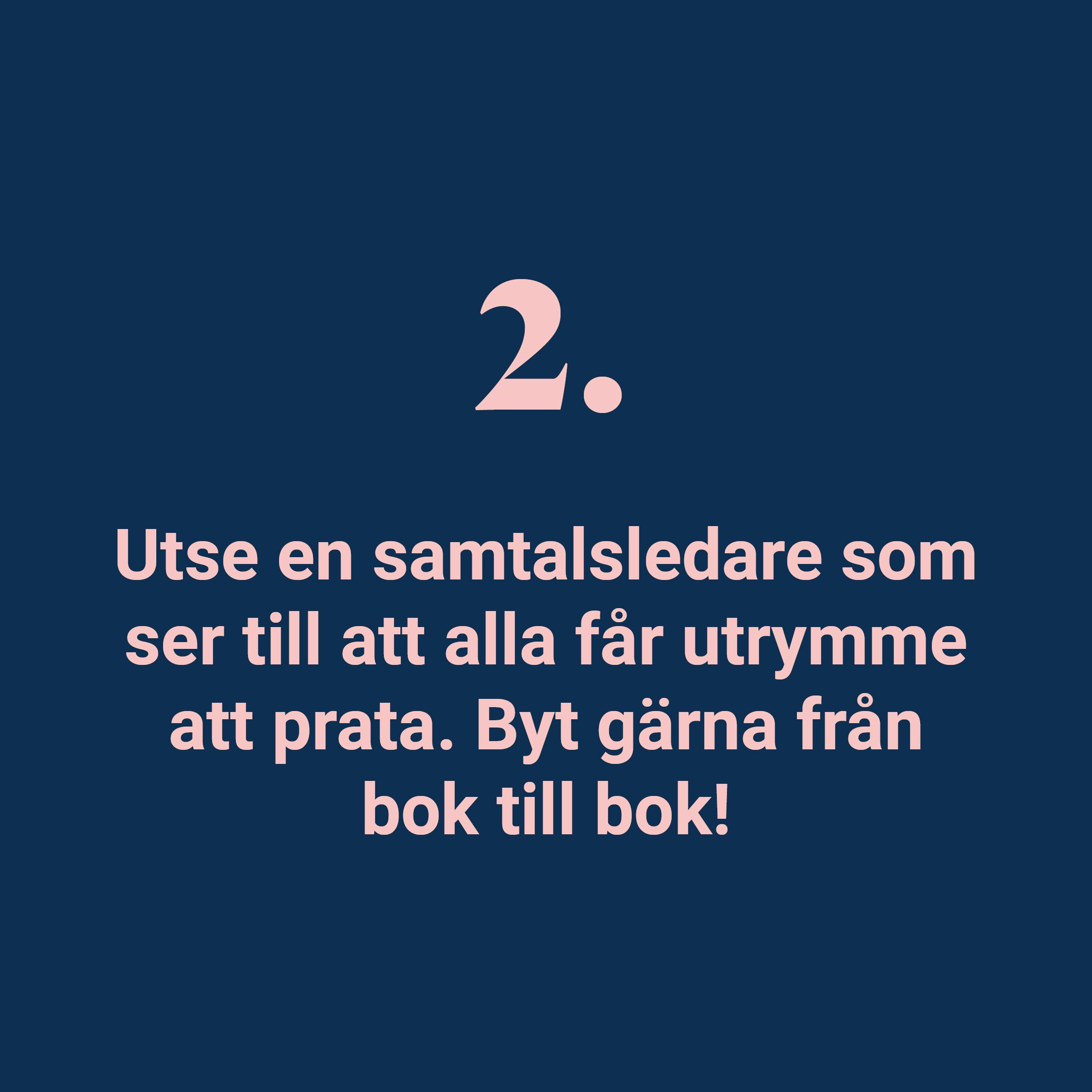 - Utse en samtalsledare. Det är tryggt att ha någon som har funderat lite mer och tänkt ut några frågor. Samtalsledaren håller också i samtalsstrukturen och tiden, så att alla får utrymme och allas erfarenheter tas tillvara. Skifta gärna samtalsledare från bok till bok.